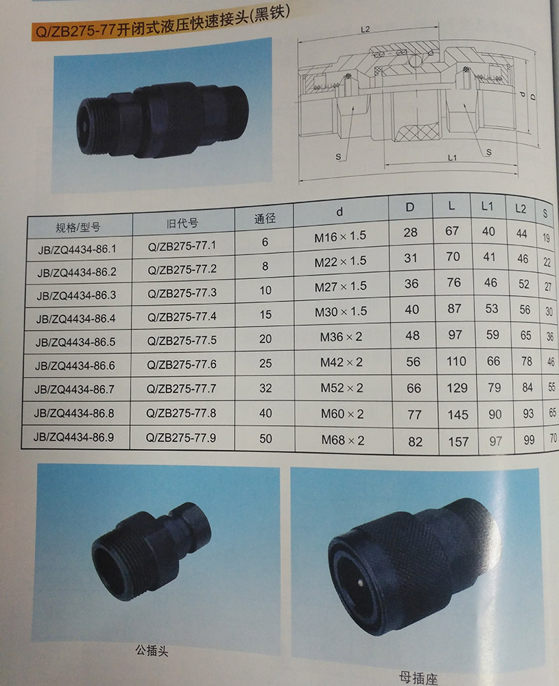 Q/ZB275-77開閉式液壓快速接頭(黑鐵): 用途與特點(diǎn): 本接頭適用于液壓系統(tǒng)中以油為介質(zhì)的場(chǎng)合,公稱壓力為320kgf/c㎡,介質(zhì)溫度為-20°C~+80°C 備注: 該快速接頭共分徑向與軸向密封二中型式,若訂徑向密封,請(qǐng)?jiān)谛吞?hào)規(guī)格后加注“徑”字樣。